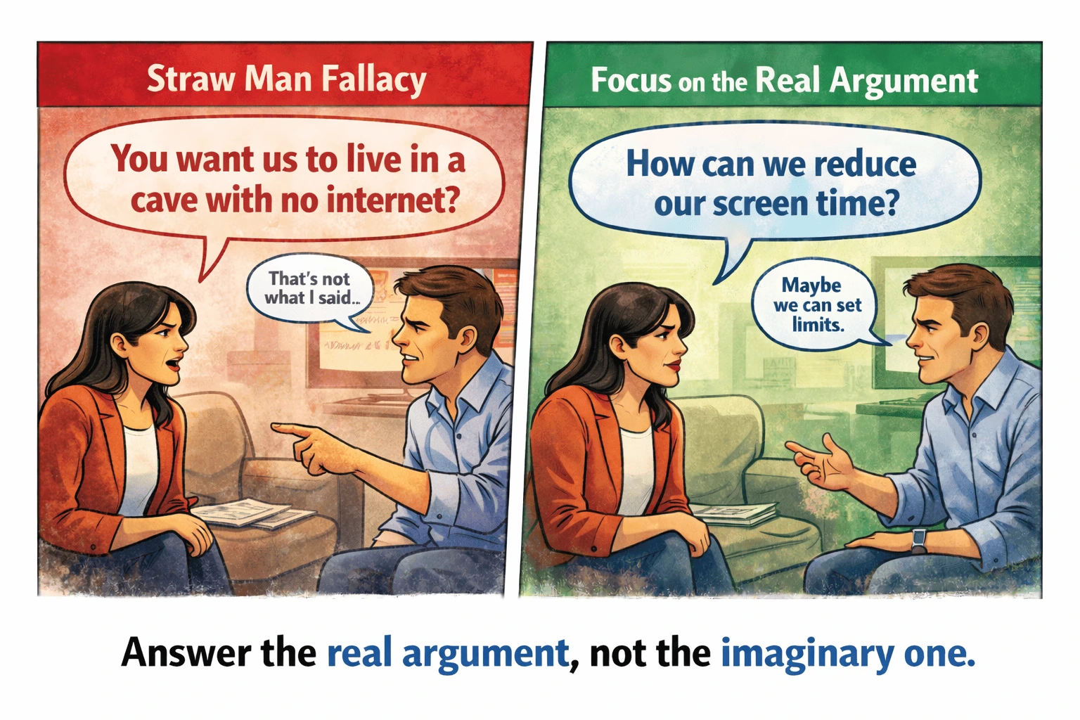 The straw man fallacy happens when someone replaces your real argument with a weaker one—and then attacks that instead.